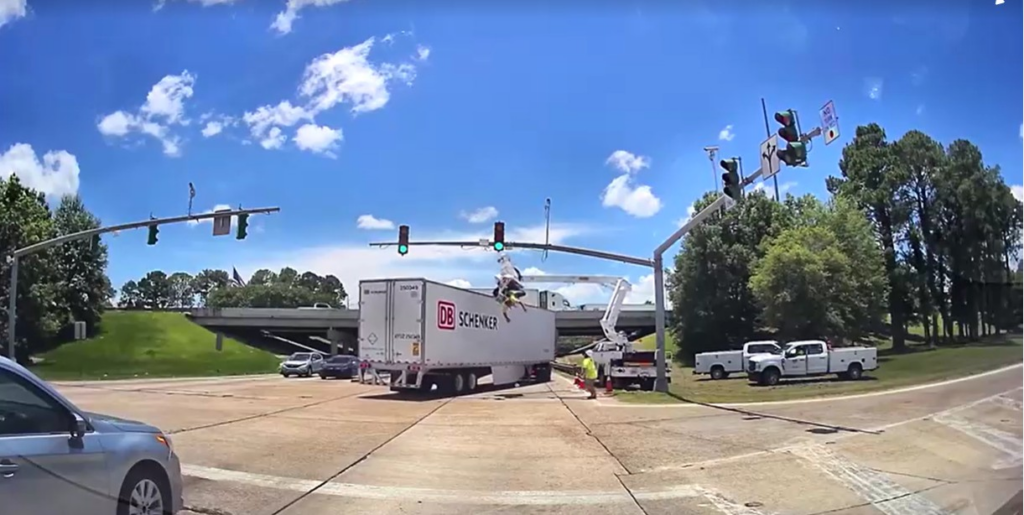 VÍDEO: Homem é atingido por carreta enquanto fazia manutenção de semáforo nos EUA e fica pendurado de ponta-cabeça