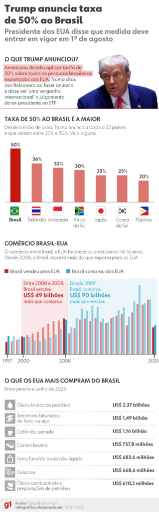 Representantes de 20 países se reuniram no Rio de Janeiro em um evento que provocou reações do presidente dos Estados Unidos. Taxação causou ‘perplexidade’ no Itamaraty. Donald Trump WILL OLIVER/POOL/EPA/Shutterstock via BBC A decisão de Donald Trump de impor uma tarifa de 50% sobre todos os produtos brasileiros importados pelos Estados Unidos foi anunciada dias […]
