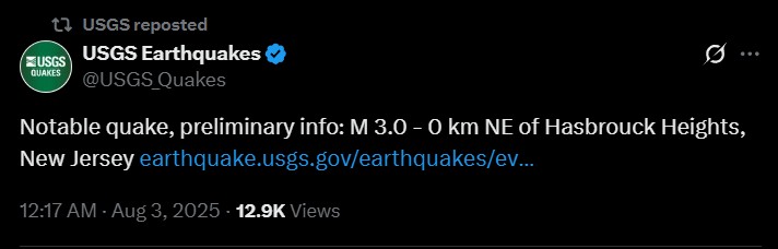 Um tremor de magnitude 3.0 foi registrado no fim da noite de sábado (2), horário local, na região metropolitana de Nova York. Segundo o Serviço Geológico dos Estados Unidos, o epicentro foi localizado em Hasbrouck Heights, no estado vizinho de Nova Jersey, a aproximadamente 10 km de profundidade. sourceFonte: G1