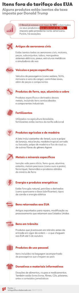 Trump assina decreto e oficializa tarifaço de 50% contra o Brasil Entram em vigor nesta quarta-feira (6) as tarifas de importação de 50% impostas pelos EUA sobre produtos brasileiros. O presidente dos Estados Unidos, Donald Trump, assinou na quarta-feira (30) um decreto que impõe uma tarifa adicional de 40% sobre produtos brasileiros, elevando o total […]
