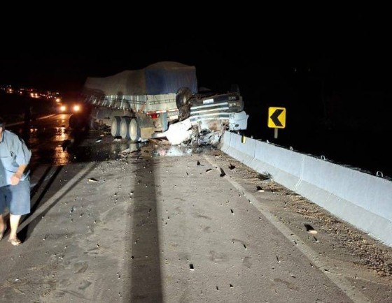 Acidente entre duas carretas e uma picape deixa um morto e dois feridos