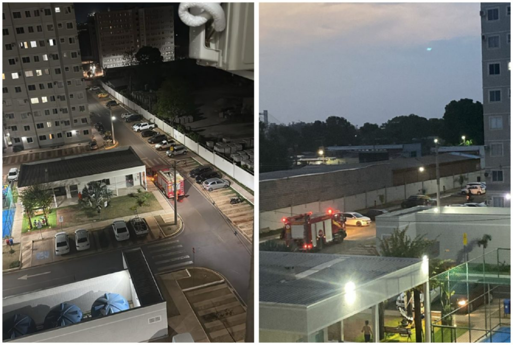 Imagens registradas no local mostram um caminhão do Corpo de Bombeiros dentro do condomínio.