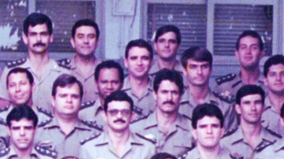 Retrato da turma da ESAO (Escola Superior de Aperfeiçoamento de Oficiais) de 1987 em que Jair Bolsonaro aparece em pé ao fundo, próximo à terceira janela, na quinta fileira. (Foto: Reprodução/Comando do Exército)